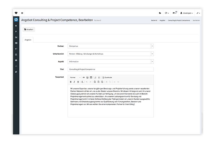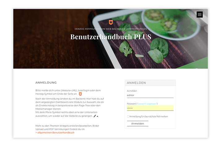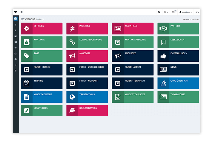 Dashboard mit Direkteinstiegen in die wichtigsten Bereiche der Website. Intuitive Navigation, Such- bzw. Filterfunktion.